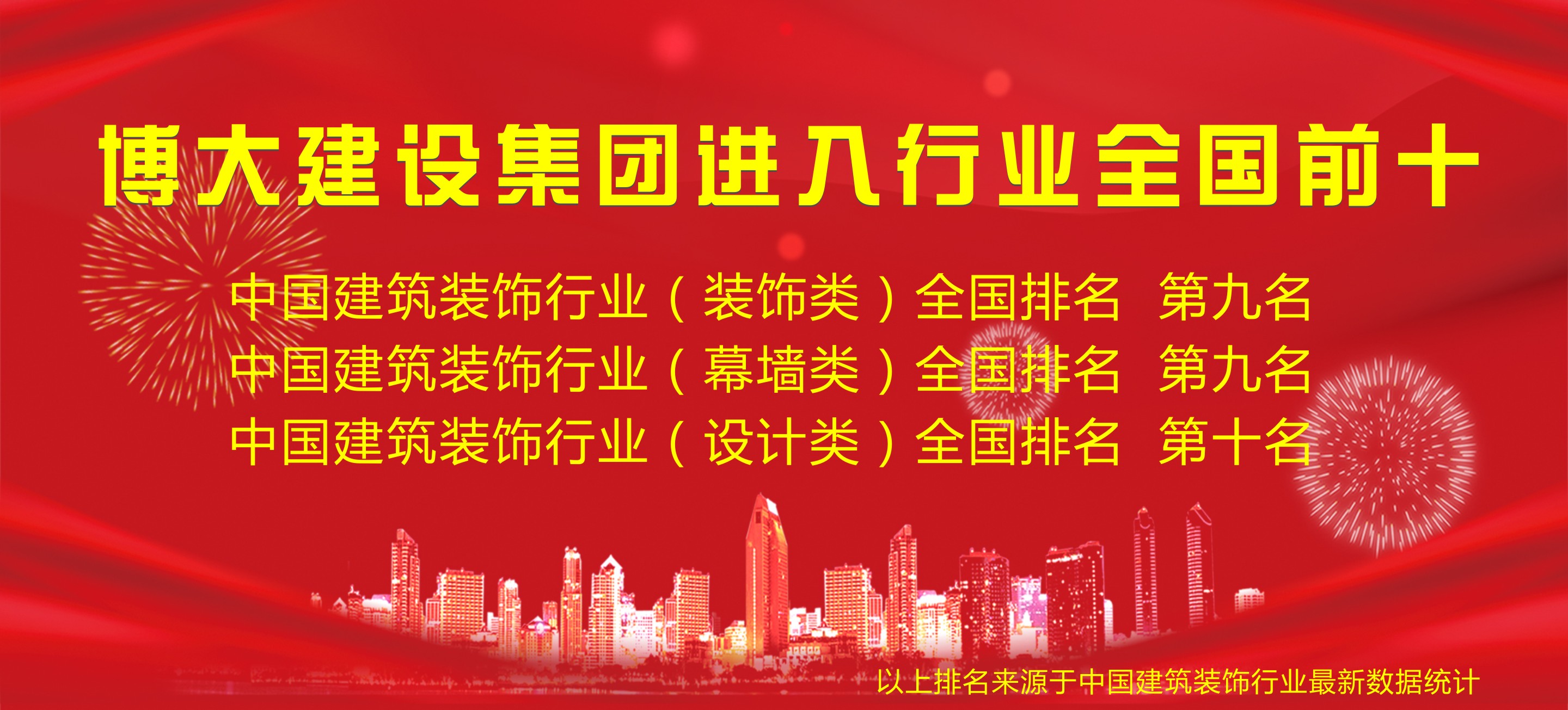 2019年1月9日,中國建筑工程裝飾頒獎大會在北京隆重舉行,根據(jù)中國建筑裝飾行業(yè)綜合數(shù)據(jù)統(tǒng)計,博大建設(shè)集團(tuán)憑借綜合實力,以奮進(jìn)姿態(tài)挺進(jìn)行業(yè)全國前十,其中,裝飾類排名全國第九、幕墻類排名全國第九、設(shè)計類排名全國第十。