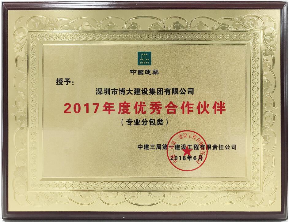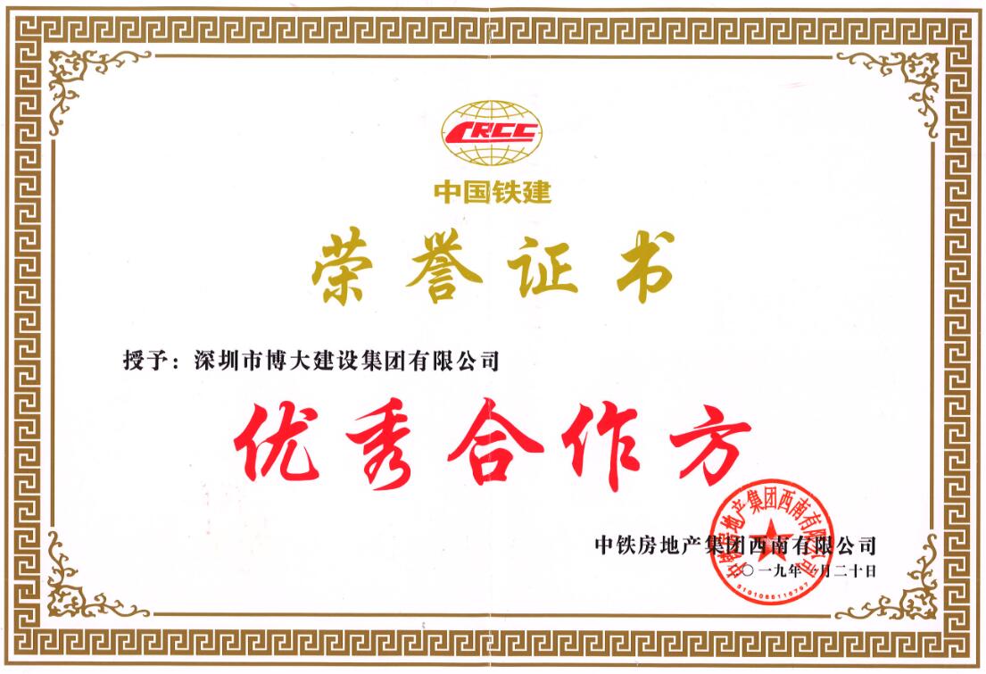博大建設(shè)集團以優(yōu)秀的工程質(zhì)量和準(zhǔn)時交期,協(xié)助中國鐵建奠定了西派國樾精裝大平層的品牌效應(yīng),榮獲中國鐵建優(yōu)秀合作方。