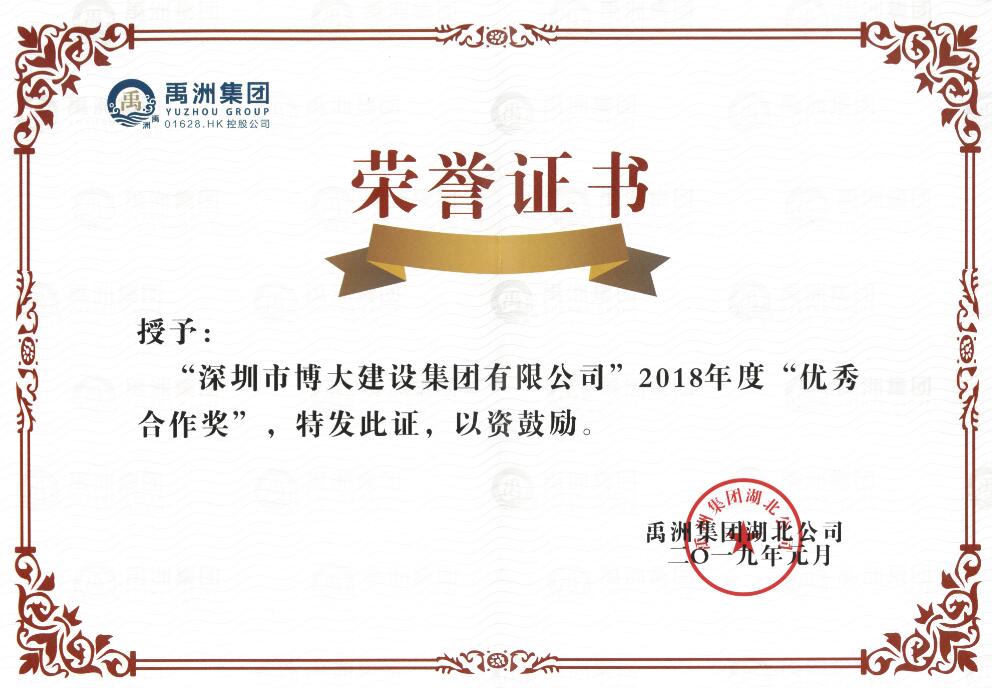 博大建設(shè)集團承建了禹洲集團湖北公司武漢賽洛城六期的精裝房工程,在武漢百盤維權(quán)的背景下,博大負(fù)責(zé)的精裝房一次性交房率達(dá)到98.41%,且工程質(zhì)量優(yōu)秀,幫助客戶成功避免了因交期、裝修質(zhì)量而造成的消費者維權(quán)風(fēng)波。博大的綜合實力和用心服務(wù)贏得禹洲集團湖北公司的高度認(rèn)可,榮獲2018年度優(yōu)秀合作獎。