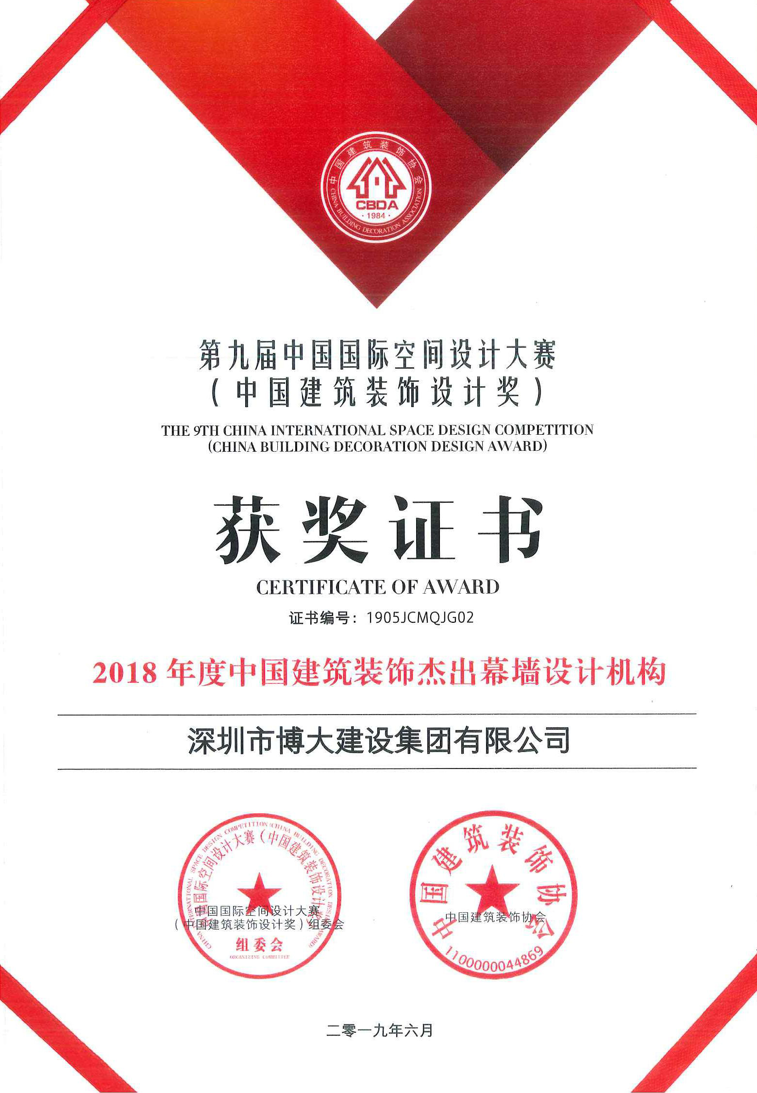 博大獲得2018年度中國建筑裝飾杰出幕墻設(shè)計(jì)機(jī)構(gòu),總裁李朕鴻榮獲商業(yè)方案類設(shè)計(jì)金獎,設(shè)計(jì)院院長方邵文榮獲娛樂空間方案類設(shè)計(jì)銀獎。