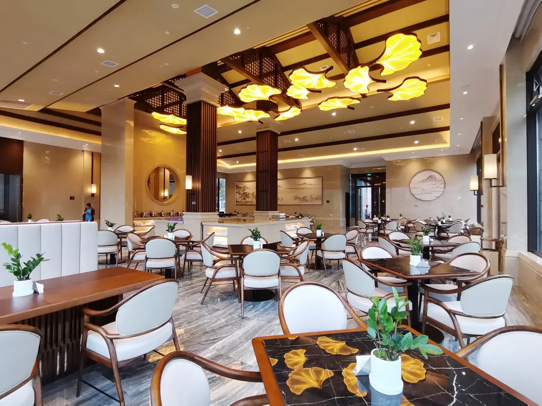 通透的全日制早餐廳,為客人帶來(lái)愜意的用餐時(shí)光。捫布硬包質(zhì)感素雅,晶瑩剔透的大理石地面及布菲臺(tái),打造此現(xiàn)代明快的用餐空間。