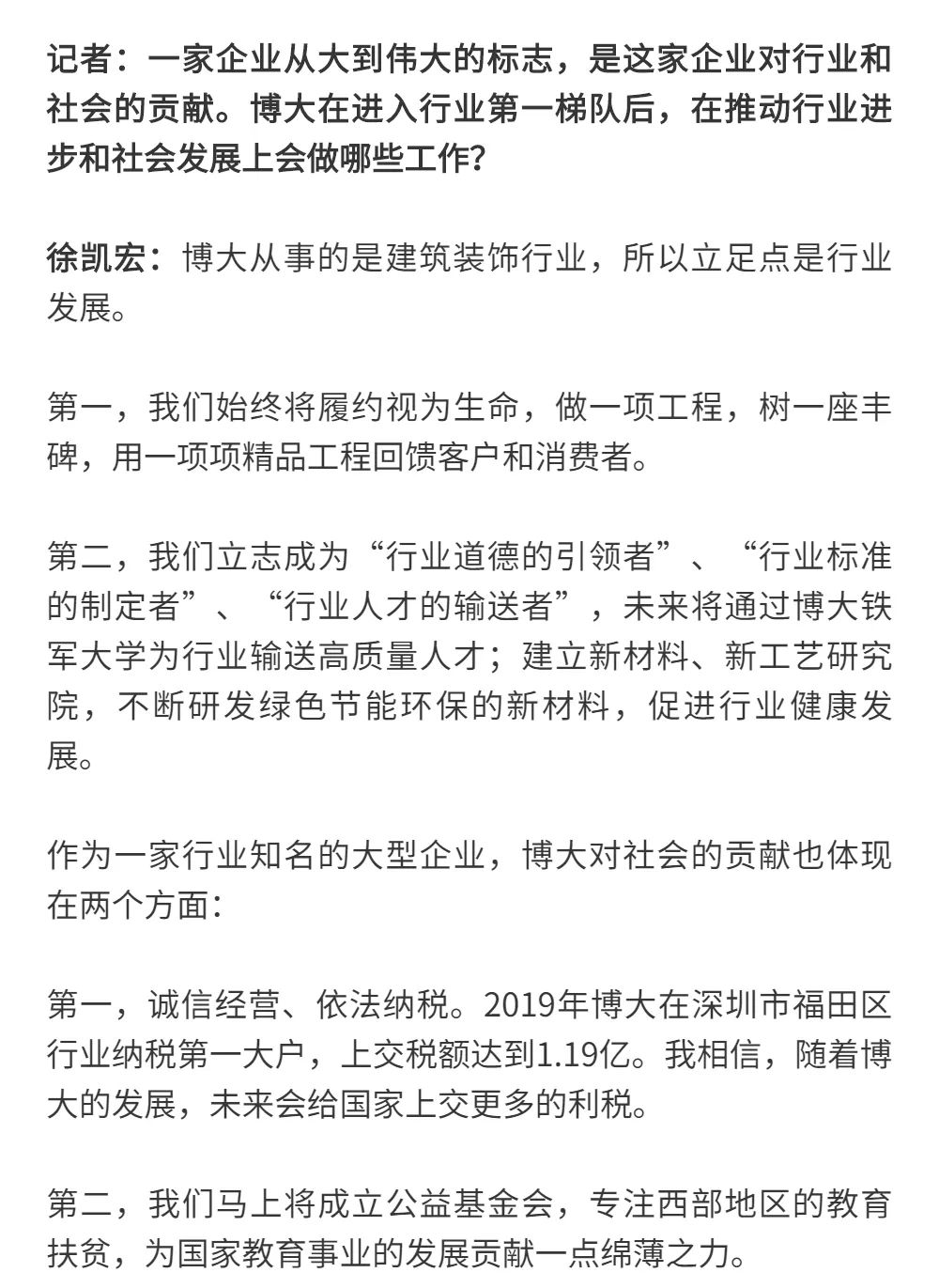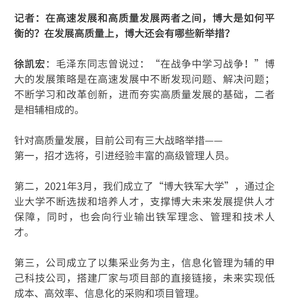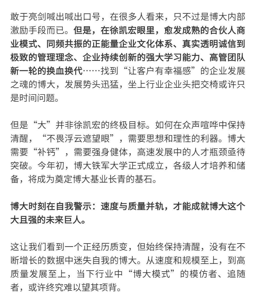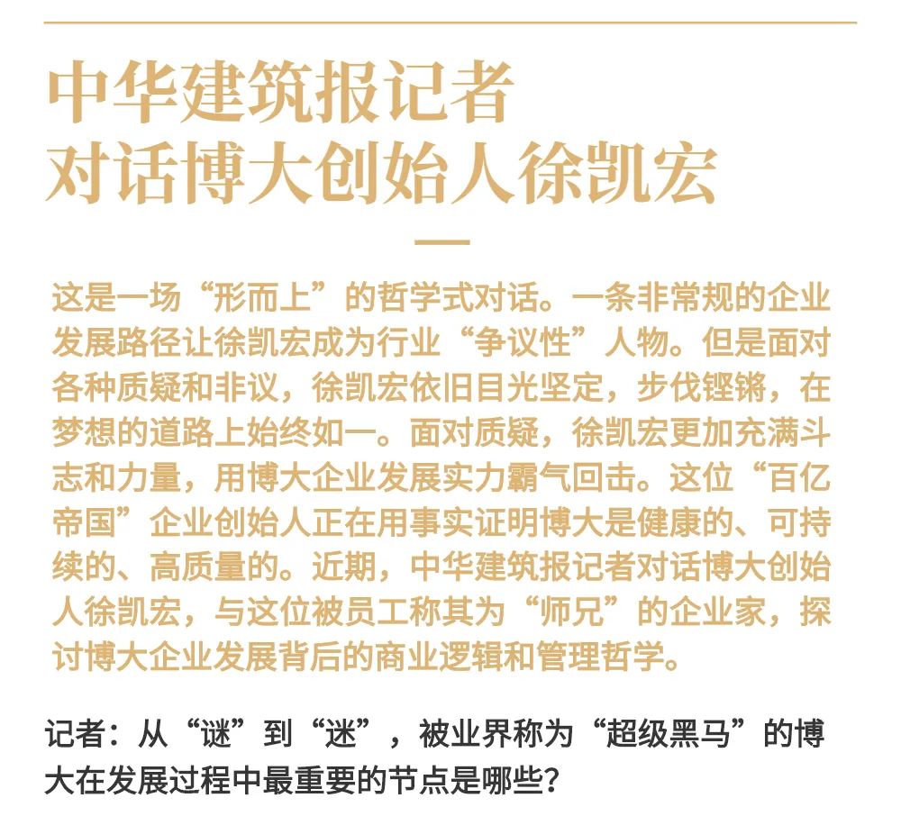 博大以雷霆之勢迅速崛起,吸引了行業(yè)的高度關(guān)注,行業(yè)權(quán)威媒體《中華建筑報》數(shù)次深入博大一線調(diào)研走訪,并對創(chuàng)始人徐凱宏先生進行了坦誠的訪談,以探討和總結(jié)博大發(fā)展的秘籍,并寫就了《進擊的博大:從高速到高質(zhì)量的創(chuàng)新逆襲》和《對話徐凱宏 | 博大正沿著高質(zhì)量發(fā)展道路堅定前行》兩篇文章。