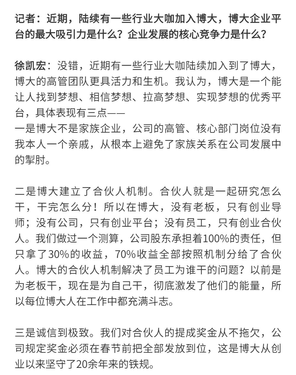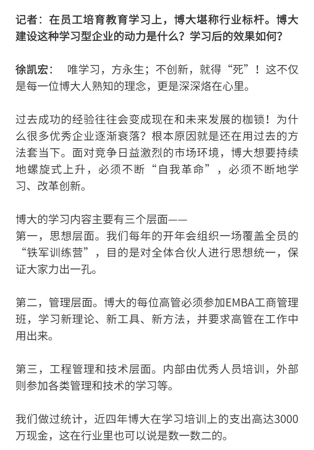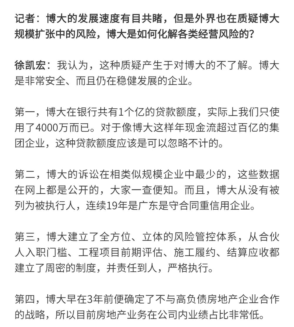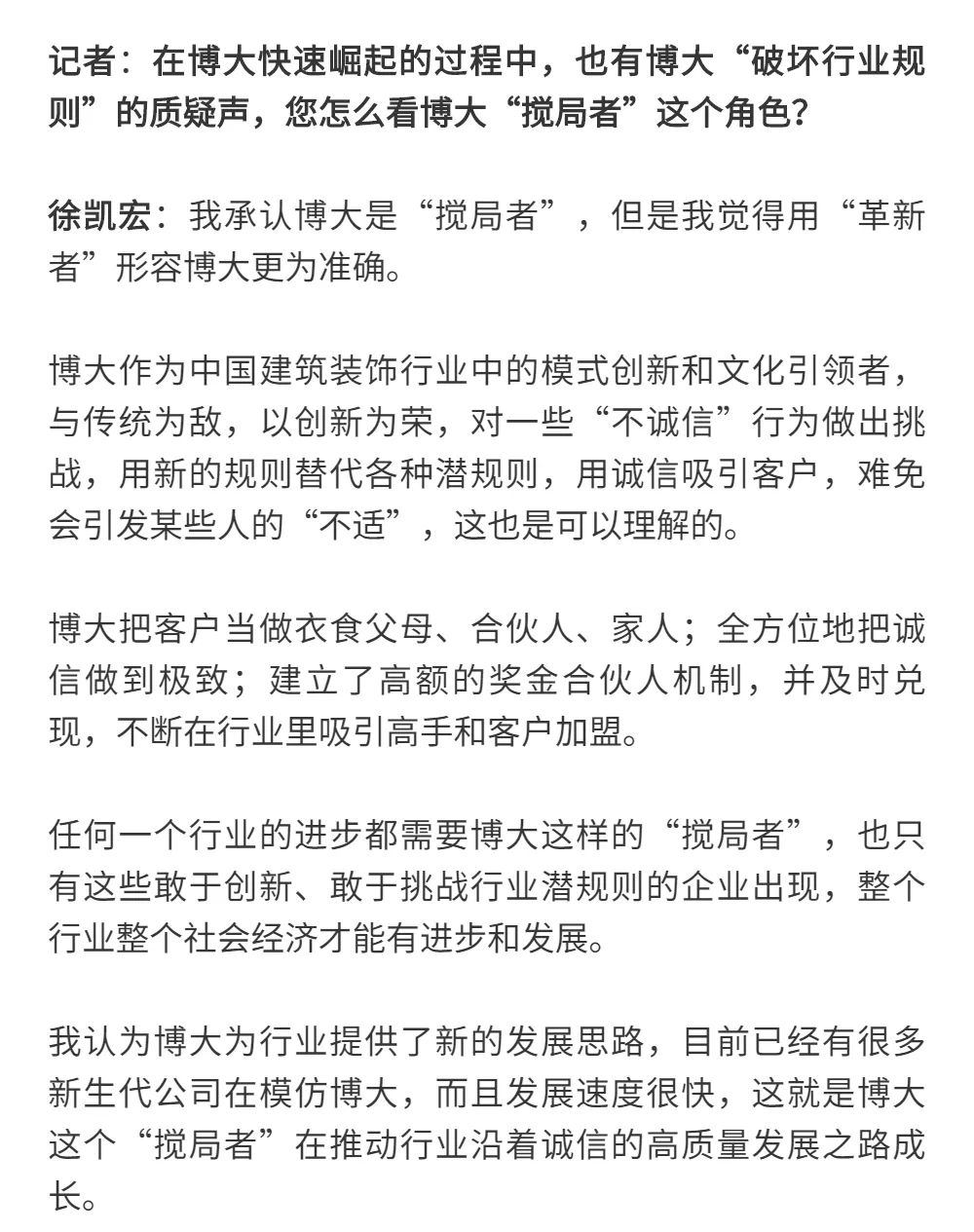博大以雷霆之勢迅速崛起,吸引了行業(yè)的高度關(guān)注,行業(yè)權(quán)威媒體《中華建筑報》數(shù)次深入博大一線調(diào)研走訪,并對創(chuàng)始人徐凱宏先生進行了坦誠的訪談,以探討和總結(jié)博大發(fā)展的秘籍,并寫就了《進擊的博大:從高速到高質(zhì)量的創(chuàng)新逆襲》和《對話徐凱宏 | 博大正沿著高質(zhì)量發(fā)展道路堅定前行》兩篇文章。