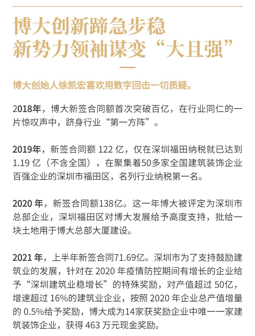 10年時間,博大業(yè)績實現(xiàn)了從10億到138億的高速增長,從默默無聞到行業(yè)知名,屢屢創(chuàng)造發(fā)展奇跡。2019年成為深圳市福田區(qū)行業(yè)排名第一的納稅大戶;2020年成為深圳市總部企業(yè);2021年榮獲深圳市政府建筑業(yè)穩(wěn)增長獎勵,成為行業(yè)唯一一家獲此殊榮的裝飾企業(yè)。
