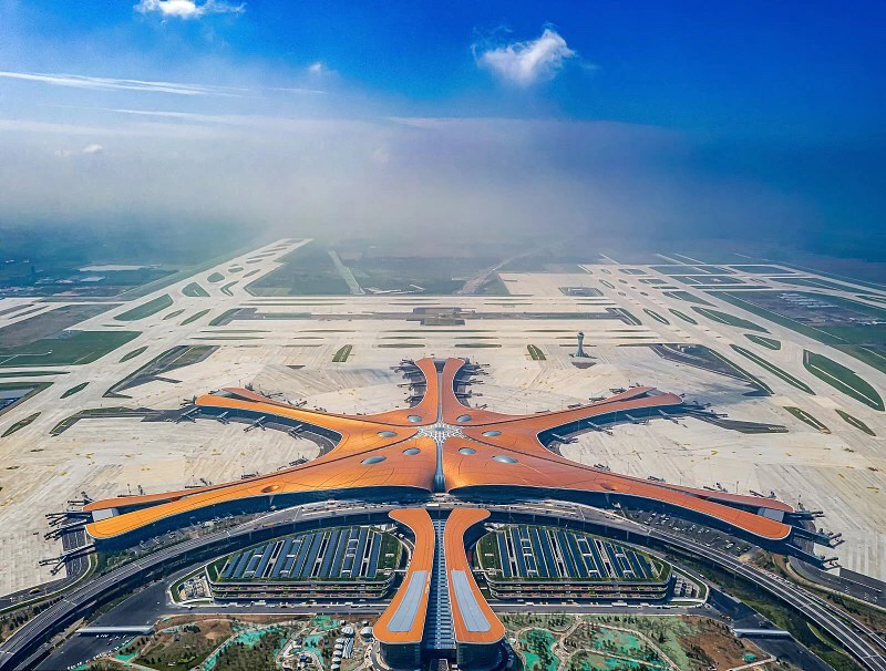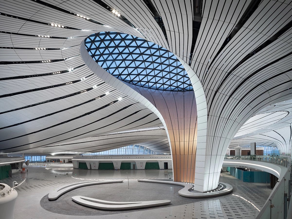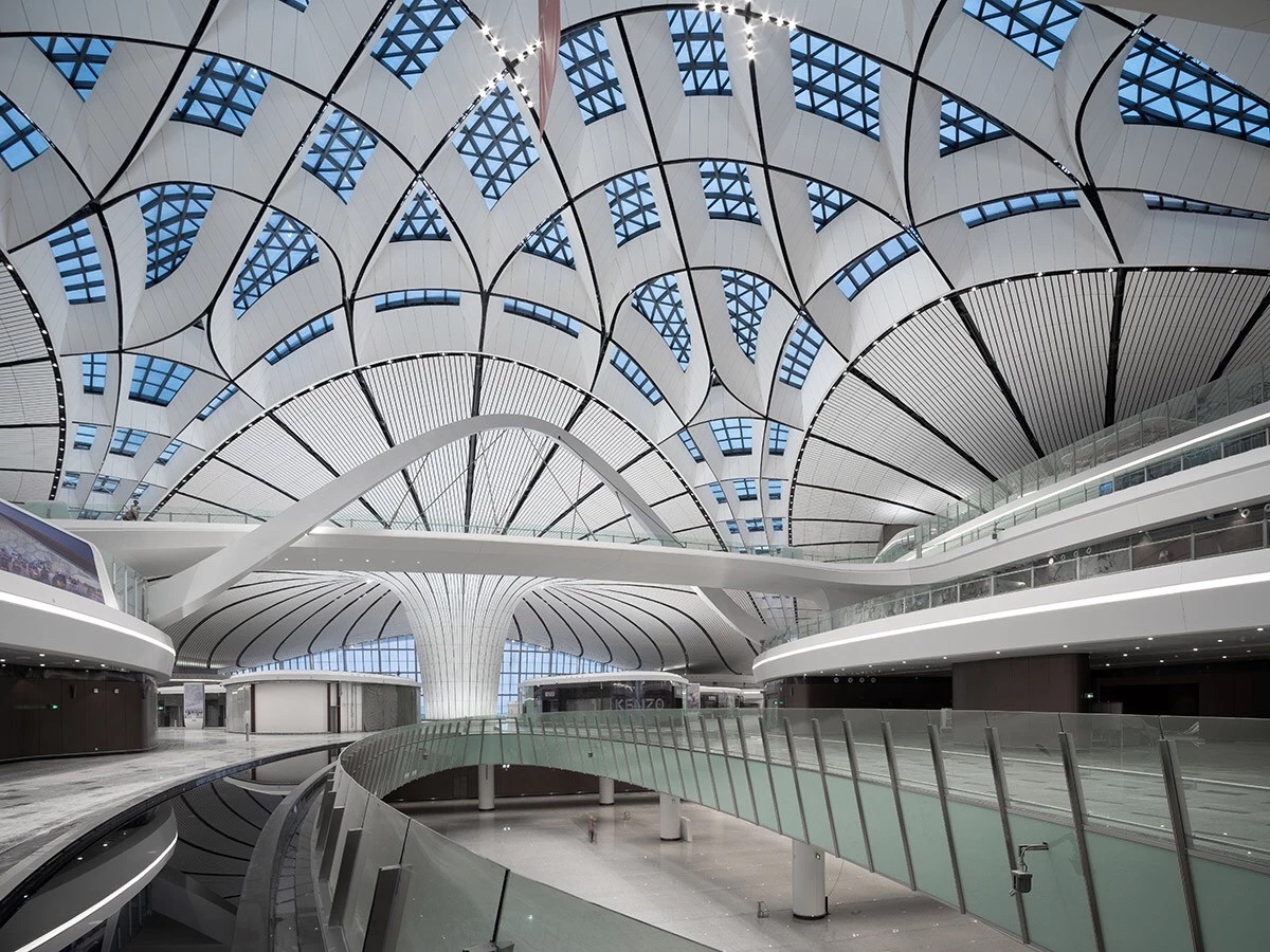 北京大興國際機場航站樓形如展翅的鳳凰,五指廊的造型完全以旅客為中心。整個航站樓有82個登機口,但是旅客從航站樓中心步行到達任何一個登機口,所需的時間不超過8分鐘。博大建設(shè)集團承建了中南指廊國際出發(fā)到達區(qū)域室內(nèi)裝飾工程。